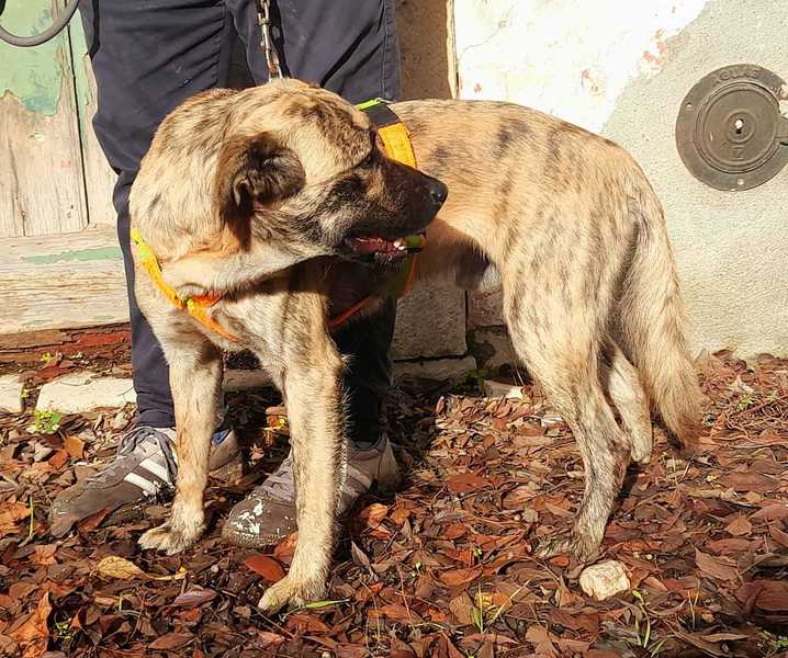 Dieser grünäugige Alien mit dem ganz irdischen Namen ,Alberto', -Berti für seine Freunde- braucht dringend ganz besondere Menschen, die sich seiner annehmen. Er wurde im Dezember mit einem Brüderchen im Dickicht gefunden und beide zeigten sich bereits sehr verwildert und ängstlich. Das Geburtsdatum wurde damals auf den 1. 9. 2022 geschätzt. Dann erkrankte Alberto am sehr seltenen Adenovirus. Neben einer Leberentzündung verursacht dieser Virus eine Hornhauttrübung, die rechts immer noch leicht vorhanden ist und behandelt wird. Den Virus hat er überstanden und ist nun immun. Grössere Sorgen macht uns allerdings dass Alberto durch die langwierige Erkrankung in Quarantäne bleiben musste , lange Zeit nicht geimpft werden durfte und dadurch in der wichtigsten Jugendphase keine Ängste abbauem konnte. Er ist dennoch kompetent im Umgang mit Hunden, auf Menschen geht er aber von selbst nicht zu, was auch mit den vielen Behandlungen zu tun hat, die er über sich ergehen lassen musste. In der Gruppe geht Alberto gerne spazieren und wird immer sicherer, aber Zivilisationsgemeinheiten erschrecken ihn noch. Alberto wiegt jetzt (Juni 2023) 12 kg bei 45cm Schulterhöhe und wird mittelgross bleiben. Wer gibt Bertis Leben eine Wende ?